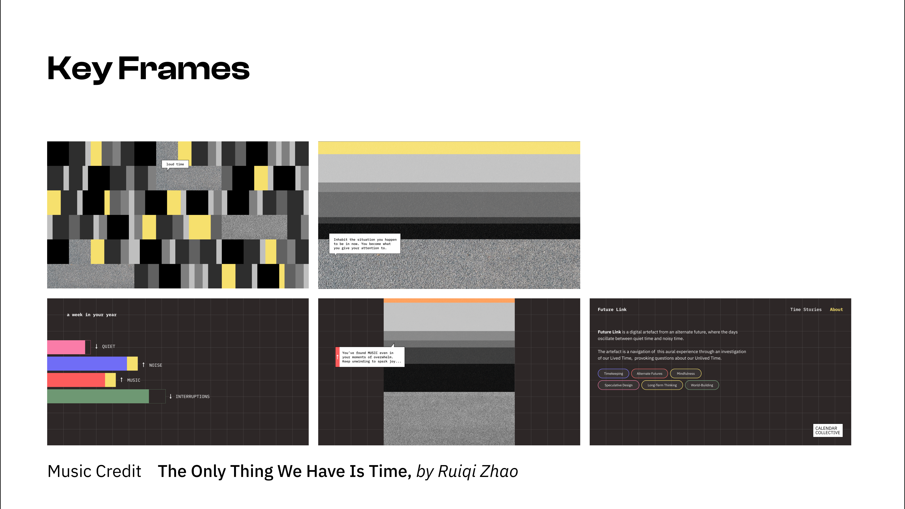 Future Link is a digital artefact from an alternate future, where the days oscillate between quiet time and noisy time. This aural experience navigates through an investigation of our Lived Time, and provokes questions about our Unlived Time.